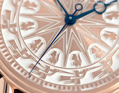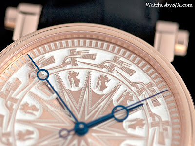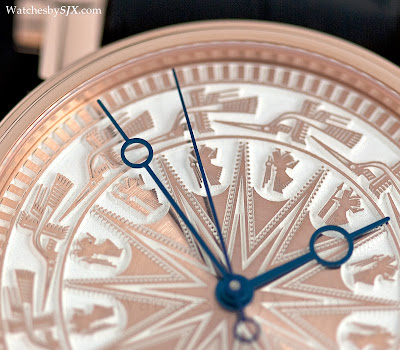 Für den Speake-Marin-Händler in Vietnam, hat der Dong Son ein solides Roségold-Zifferblatt mit fliegenden Reißen und Kriegerfiguren. Ungewöhnlich, statt der üblichen Handgravur, wird das Dong Son Zifferblatt durch chemisches Ätzen geschaffen.
